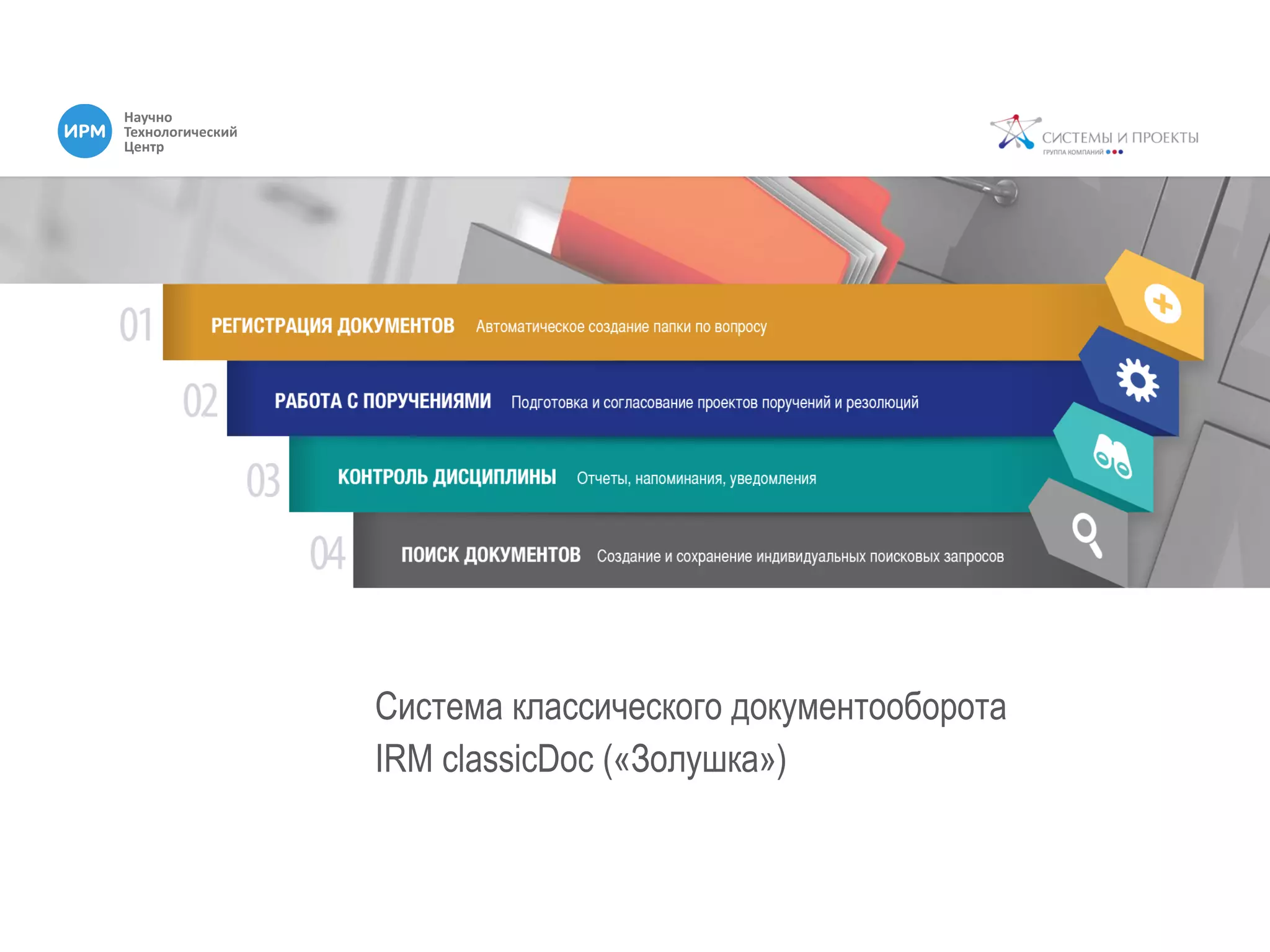 Документ описывает систему электронного документооборота irm classicdoc, предназначенную для автоматизации работы в государственных и муниципальных учреждениях, а также малом бизнесе. Основные функции системы включают регистрацию документов, формирование резолюций и контроль исполнения поручений, что способствует упорядочиванию работы с документами и повышению исполнительской дисциплины. irm classicdoc также предлагает возможности для интеграции, настройки рабочего пространства пользователей и гарантирует безопасность данных.