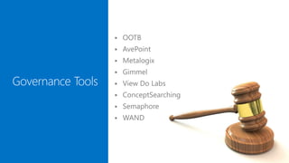 This document discusses challenges and solutions related to using SharePoint as a document management system. It addresses issues such as lack of audit history, too much audit data, sensitive information being disclosed, and useful information not being found. It provides recommendations around templates, grammar, and compliance tools to help address these challenges. Links are provided to resources about classification tools, eDiscovery and search tools, and ensuring compliance with standards like PCI.