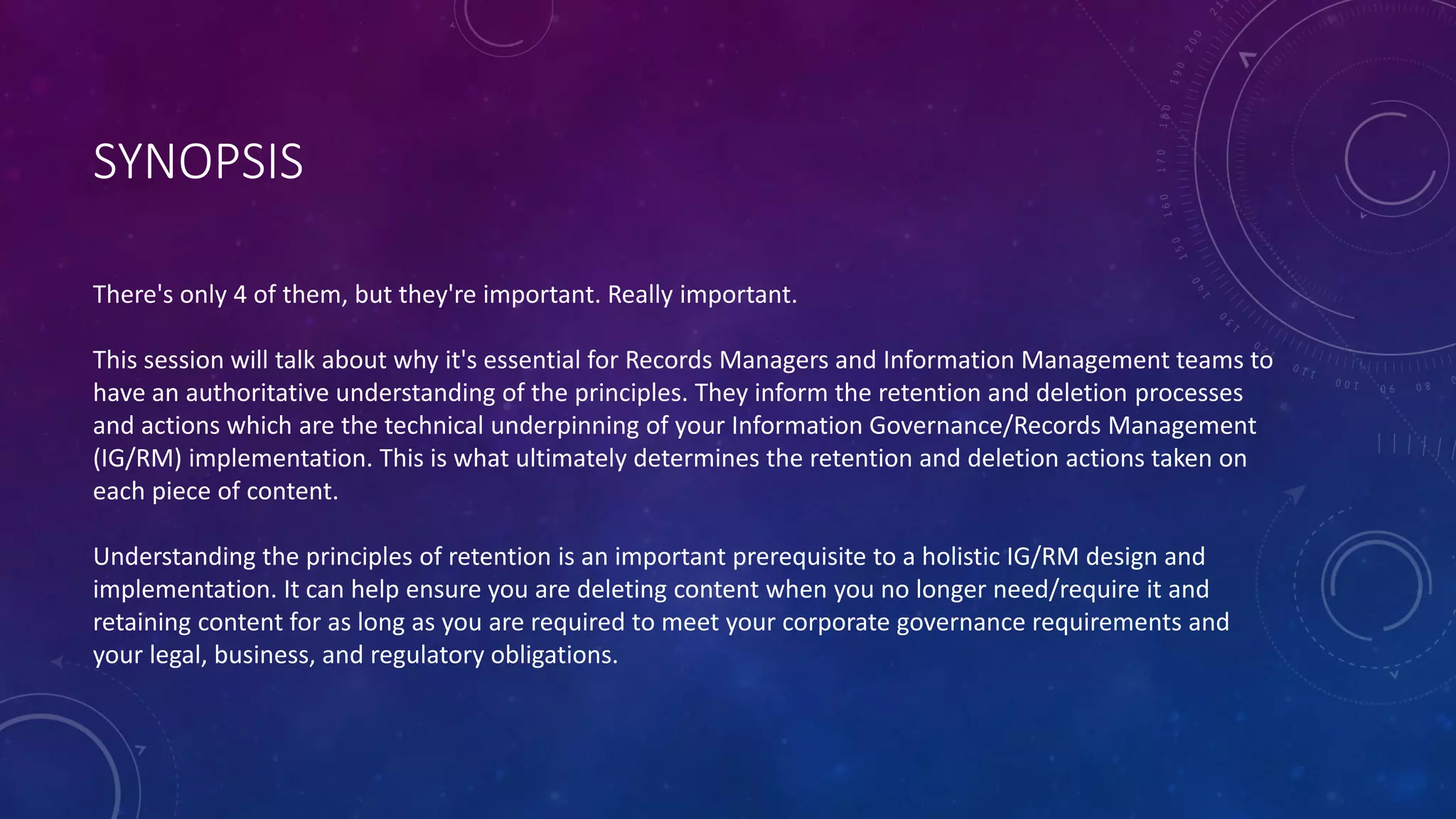 This document provides a summary of a presentation on the principles of retention in Microsoft 365. It discusses why understanding the principles is important for ensuring compliance with retention requirements. The presentation covers the essentials to understand before learning the principles, including how retention policies and labels differ and how they can be applied. It then walks through the four principles of retention - that retention wins over deletion, the longest retention period wins, explicit settings win over implicit ones, and the shortest deletion period wins. Examples are provided to illustrate how the principles are applied.