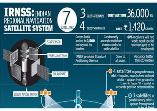 IRNSS is India's independent regional navigation satellite system consisting of seven satellites providing accurate positioning to users in India and within 1500 km of its borders. The system includes space, ground, and user segments. The space segment uses three geostationary and four geosynchronous orbiting satellites. The ground segment controls and maintains the satellites. The user segment utilizes dual-frequency receivers. IRNSS aims to provide positioning accuracy under 20 meters within its coverage area for various navigation and timing applications.