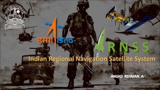 The Indian Regional Navigation Satellite System (IRNSS) is India's independent regional navigational satellite system. It consists of 7 satellites in geostationary orbit that provide navigation services to users in India and the surrounding 1500-2000 km region. IRNSS aims to provide accurate position information services to users in India as well as the surrounding region. It is intended to provide two types of services: special position service and precision service.