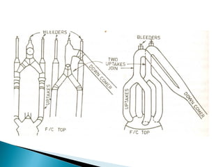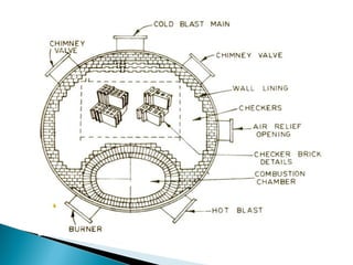 3. Stoves are used to heat incoming blast with heat from cleaned furnace gas in a cyclic process, maintaining a steady, preheated blast supply to the furnace.
