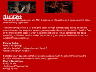 The opening title sequence of Iron Man 3 establishes several narrative elements including enigma codes that pique audience interest and binary oppositions typical of action films. It introduces the protagonist as a heroic and powerful superhero through his high-tech costume and weaponry. Cinematography depicts the protagonist as dominant through low angle shots, and implies he will face violence through close-ups of his bloodied face. The sequence establishes the film's settings of a busy city and desert, hinting the city may be in danger.