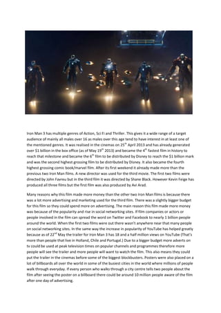 Iron Man 3 stars Robert Downey Jr. as Tony Stark who faces threats from a terrorist group called the Mandarin. After Stark's home is attacked, he tracks members of the Mandarin group to Tennessee. He discovers the Mandarin is a creation of Aldrich Killian seeking revenge against Stark. Killian's plan is to kidnap the President, but Stark works to defeat Killian and rescue Pepper Potts, saving the President. The film was a major box office success, grossing over $1 billion due to extensive marketing using social media and other techniques not available for earlier Iron Man films.