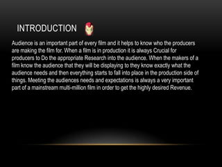 This document discusses the marketing campaign for Iron Man 3. It analyzes the target audience, which was Marvel fans and mainstream audiences aged 13-30s. The film had a large budget of $200 million. Walt Disney Studios distributed the film, allowing it to reach a broad audience from children to adults. The marketing campaign utilized various traditional and digital advertisements, including billboards, websites, and trailers. The ads were designed to generate interest without revealing too much of the plot. Analyzing target demographics was important to effectively promote the sequel to Iron Man fans.