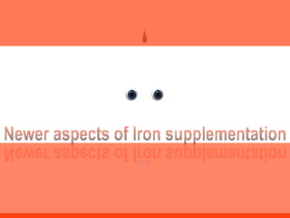 The document discusses newer aspects of iron supplementation. It summarizes that iron amino acid chelate, or ferrous bis glycinate, has advantages over other forms of iron supplementation, including being non-buffered in the stomach, non-precipitated in the intestine, not antagonized by phytates, and having superior and dependable bioavailability due to its unique chelate design, which potentially allows for smaller doses with fewer side effects. The document examines what is known, unknown, and needs to be known about different forms of iron supplementation and their absorption parameters.
