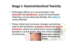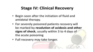 Iron is an essential element but can be toxic in high amounts. Iron poisoning most often occurs when children accidentally ingest iron supplements. Symptoms of iron toxicity can be severe and include vomiting, abdominal pain, shock, liver damage, and gastrointestinal bleeding and necrosis. Diagnosis involves measuring serum iron levels and a chelation challenge test. Treatment focuses on gastric lavage, administering charcoal or antacids, correcting dehydration and acidosis, and chelation therapy with desferrioxamine or deferiprone to remove excess iron from the body.