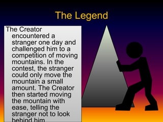 The Iroquois have a legend that explains the origin of their healing masks. According to the legend, the Creator challenged a stranger to a mountain moving contest and banished the stranger when he tried to peek, leaving his face disfigured. Iroquois masks are carved onto living trees and used in healing rituals by the False Face Society to invoke spirits and cure the sick, who then join the society. The masks represent direct spiritual connections in Iroquois culture and were taken back by the Iroquois when they began being sold as artifacts for profit against their wishes.