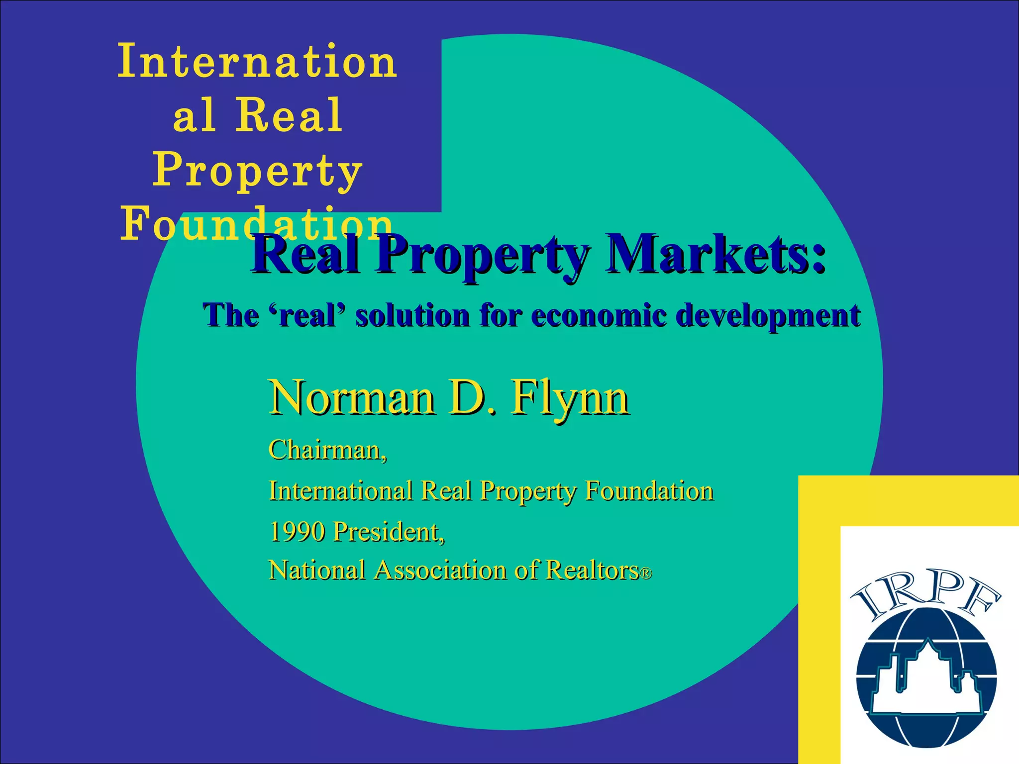 The document discusses the mission and work of the International Real Property Foundation (IRPF). The IRPF aims to establish private real property markets worldwide which are essential for strong economies. It works with real estate associations to provide training, consensus building, and problem solving expertise. Some of its successes include increasing homeownership rates and the professionalization of real estate associations in Eastern Europe and former Soviet states. It recommends strengthening international real estate communities and bringing developing country associations up to international standards.