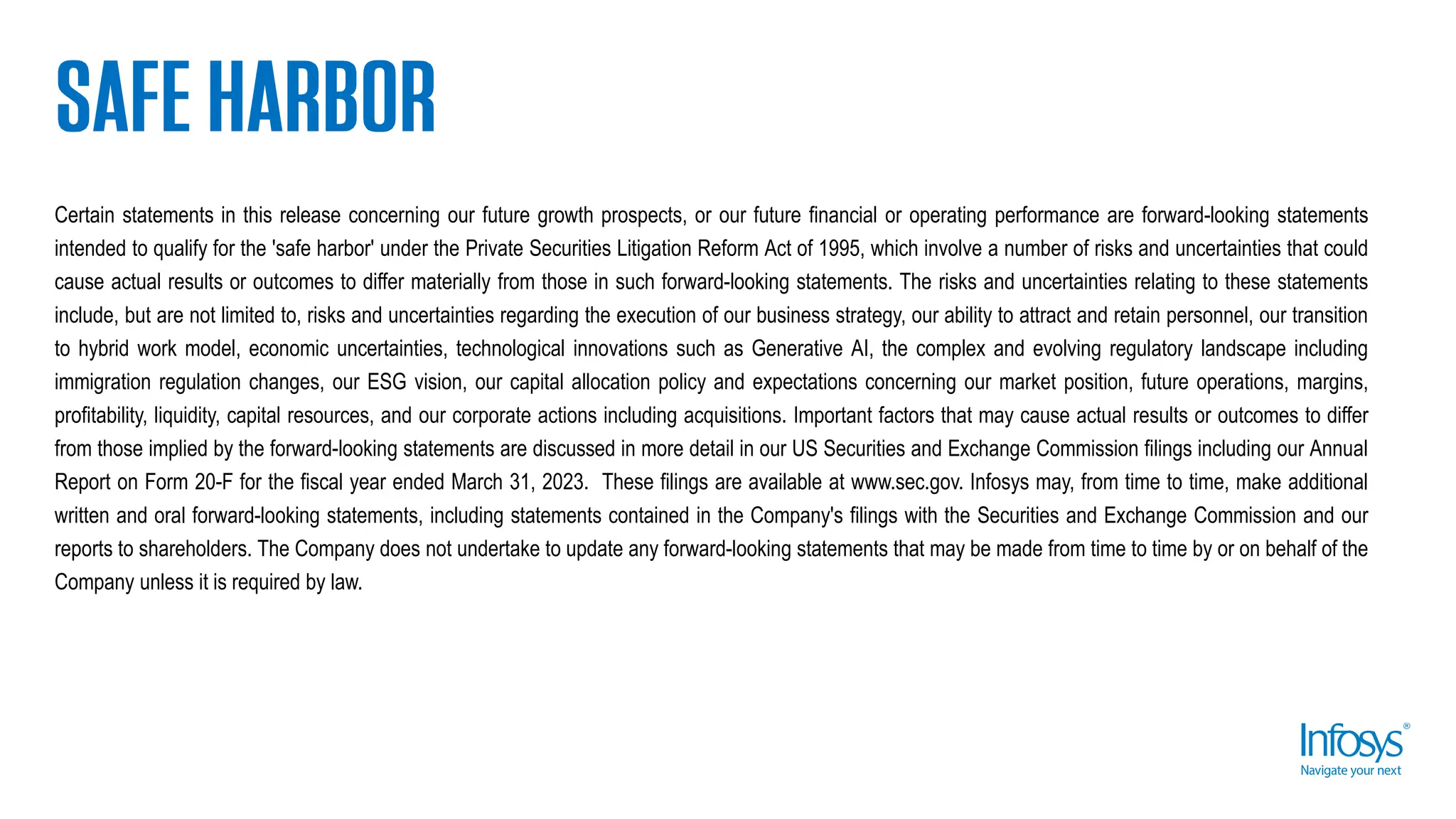 The document discusses certain forward-looking statements regarding Infosys' future growth prospects and financial performance that involve risks and uncertainties. It notes key risks such as execution of business strategy, attracting and retaining talent, transition to hybrid work model, economic uncertainties, and regulatory changes. The document provides Infosys' market position, business segments, and financial highlights. It also outlines the company's strategic priorities such as continuing digital intensity, next generation technologies, people development and sustainability to achieve continued growth.
