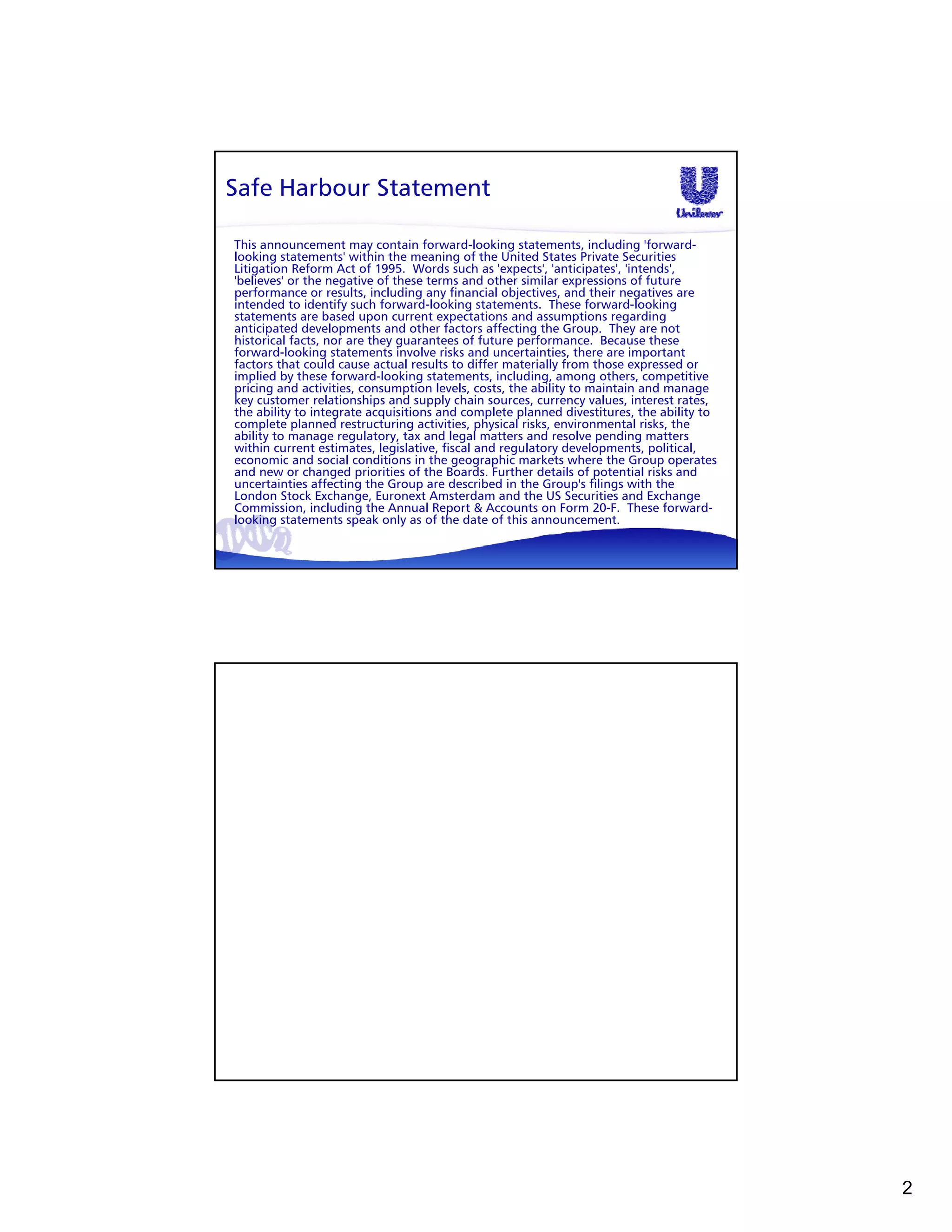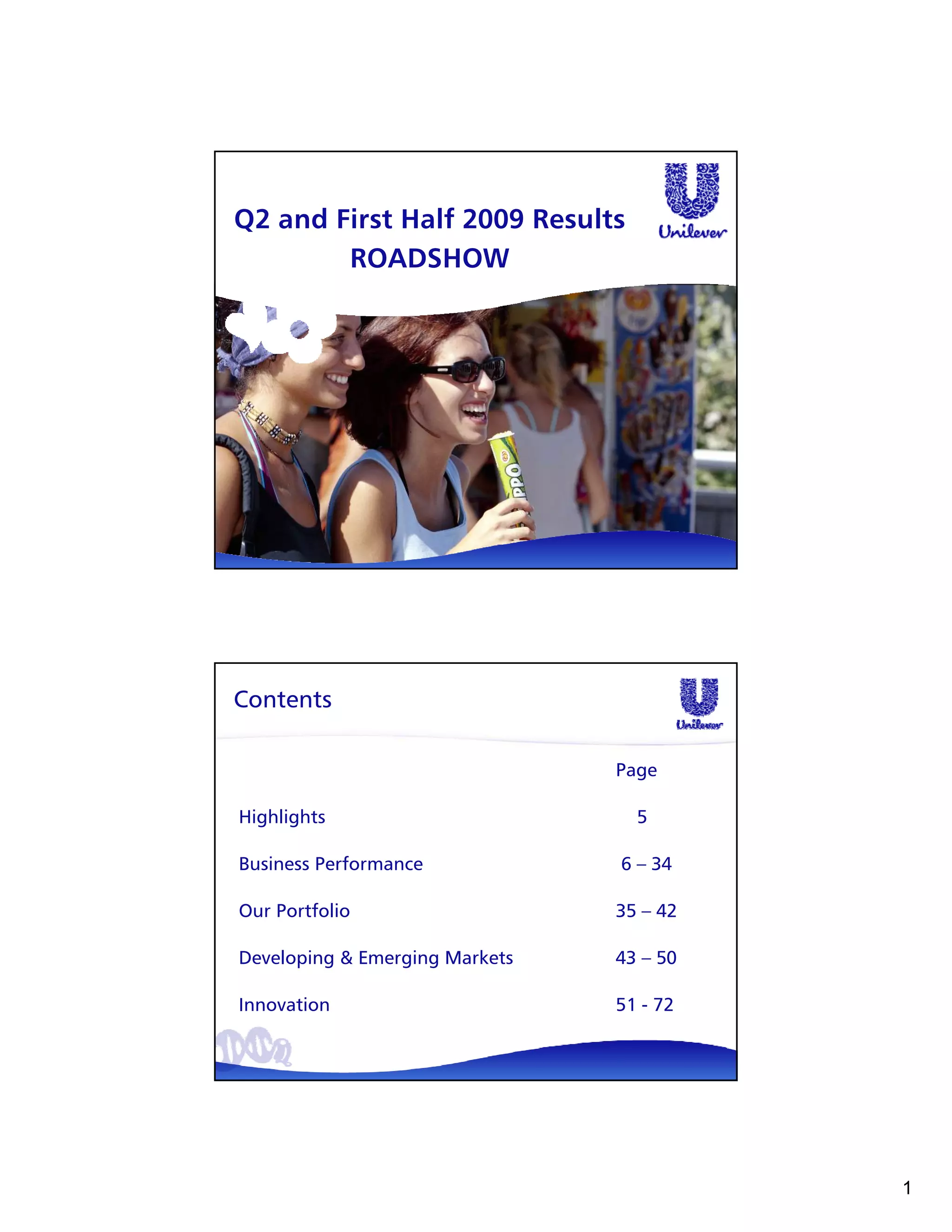 This document provides a summary of Unilever's Q2 2009 results and business performance. [1] Unilever restored volume growth of 2.0% in Q2 2009 and stepped up advertising and promotion investments by 50 basis points. [2] Underlying operating margin was down 60 basis points in line with expectations due to higher investments in advertising. [3] Cash flow improved by €1.6 billion in the first half of 2009 and net debt was €8.9 billion.