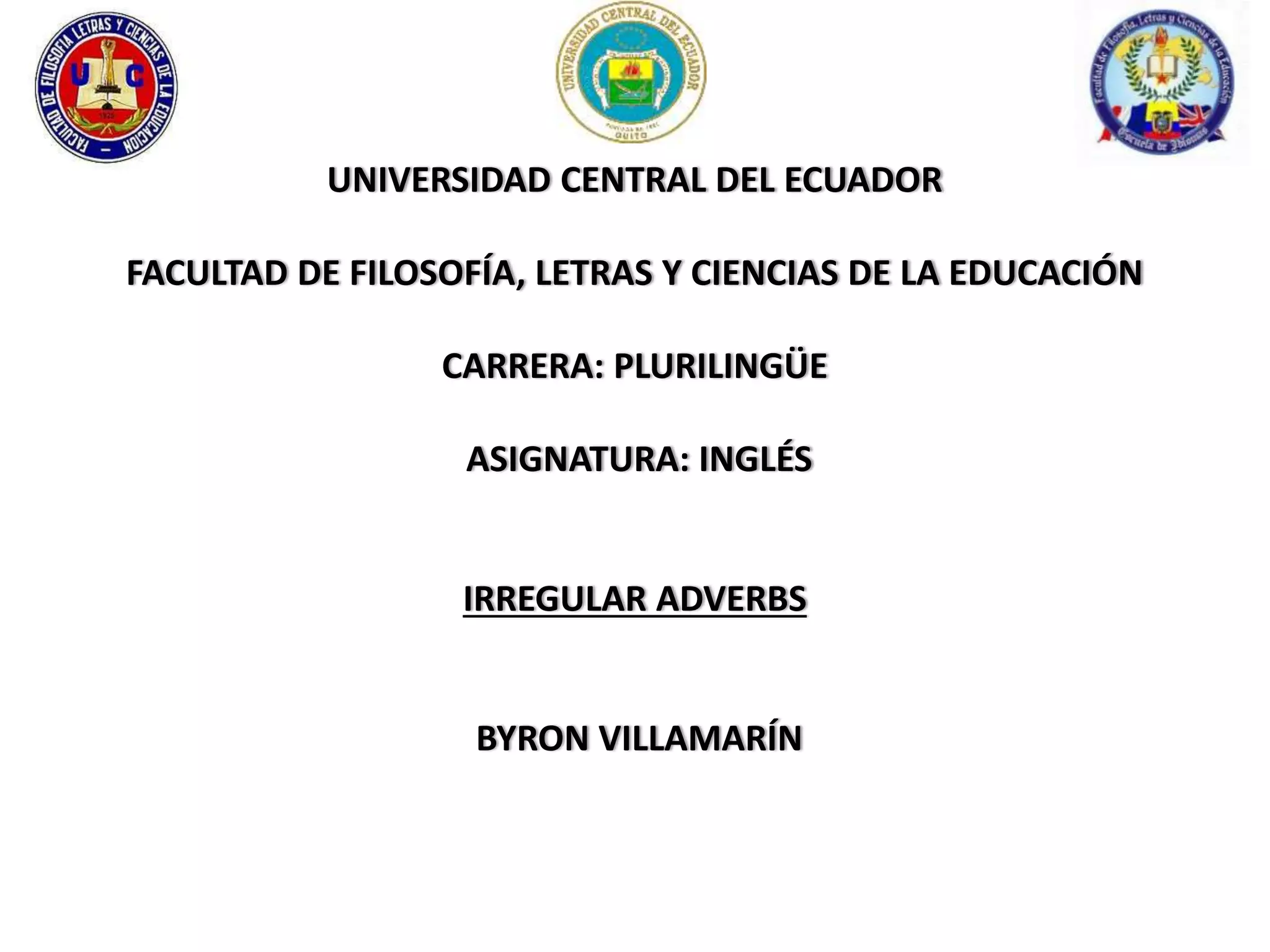 This document discusses irregular adverbs in English. It provides a list of common adjectives whose adverb forms do not follow the typical pattern of adding "-ly", such as "good" becoming "well" and "fast" remaining "fast". The document also highlights example sentences that use these irregular adverbs correctly compared to incorrect usages where the adjectival form is used instead. Finally, it lists some other irregular adverbs that do not end in "-ly", such as "far", "fast", "hard", and "well".