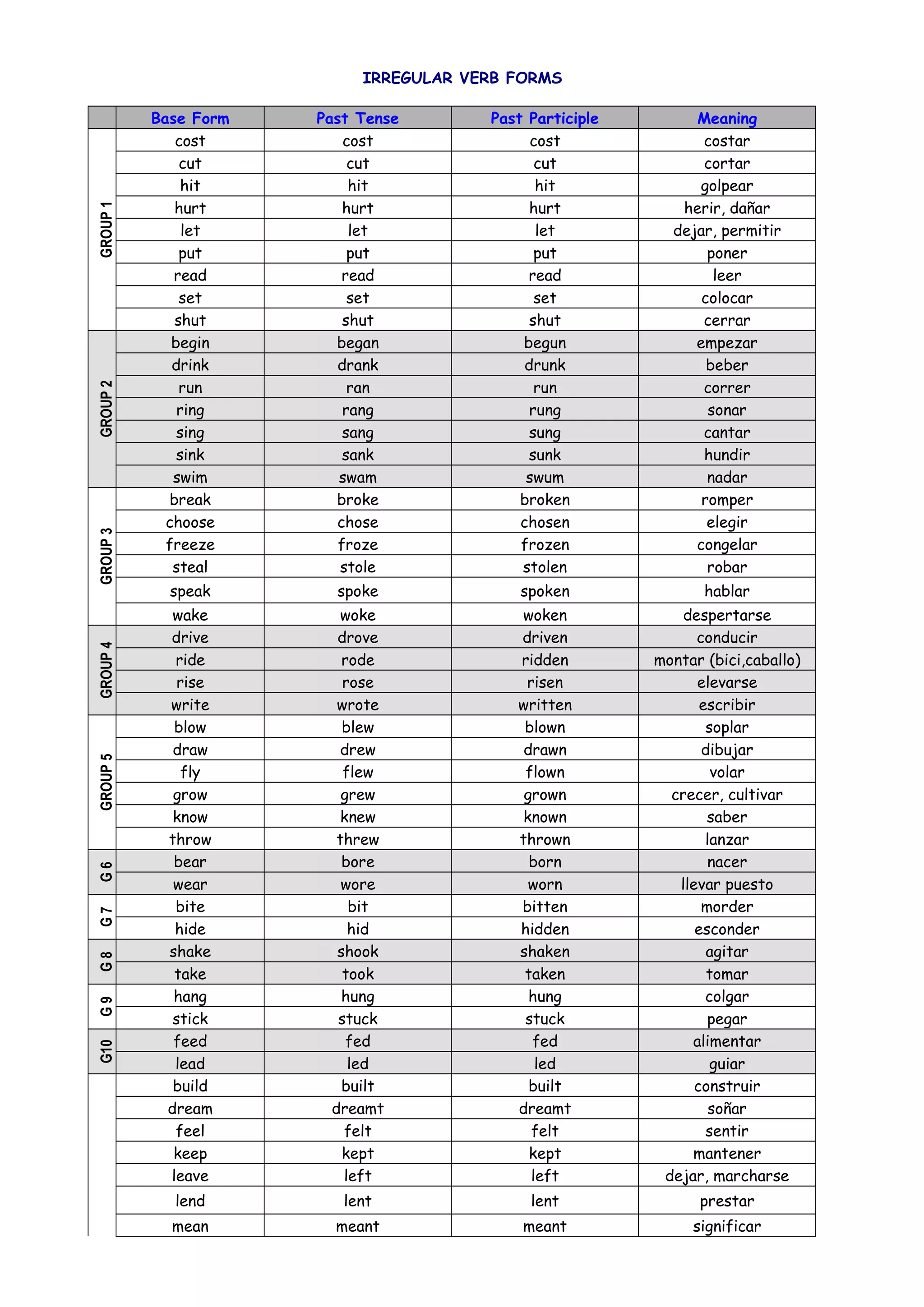 This document contains a table listing irregular verb forms in English. It includes the base form, past tense, past participle, and meaning for 50 different irregular verbs. The verbs are grouped together based on their patterns of conjugation.