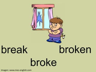 The document lists English verb conjugations for the past tense and past participle forms of common verbs. Each verb's infinitive, past tense, and past participle forms are provided sequentially for quick reference of their conjugated forms.