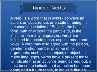 This document discusses different types of verbs including regular verbs, irregular verbs, and provides a short list of irregular verbs. It explains that regular verbs follow typical grammatical rules for conjugation while irregular verbs do not. Regular verbs take on consistent endings to indicate things like tense, while irregular verbs have forms that do not follow standard patterns. The document also notes that irregular verbs are often among the most commonly used verbs in a given language.