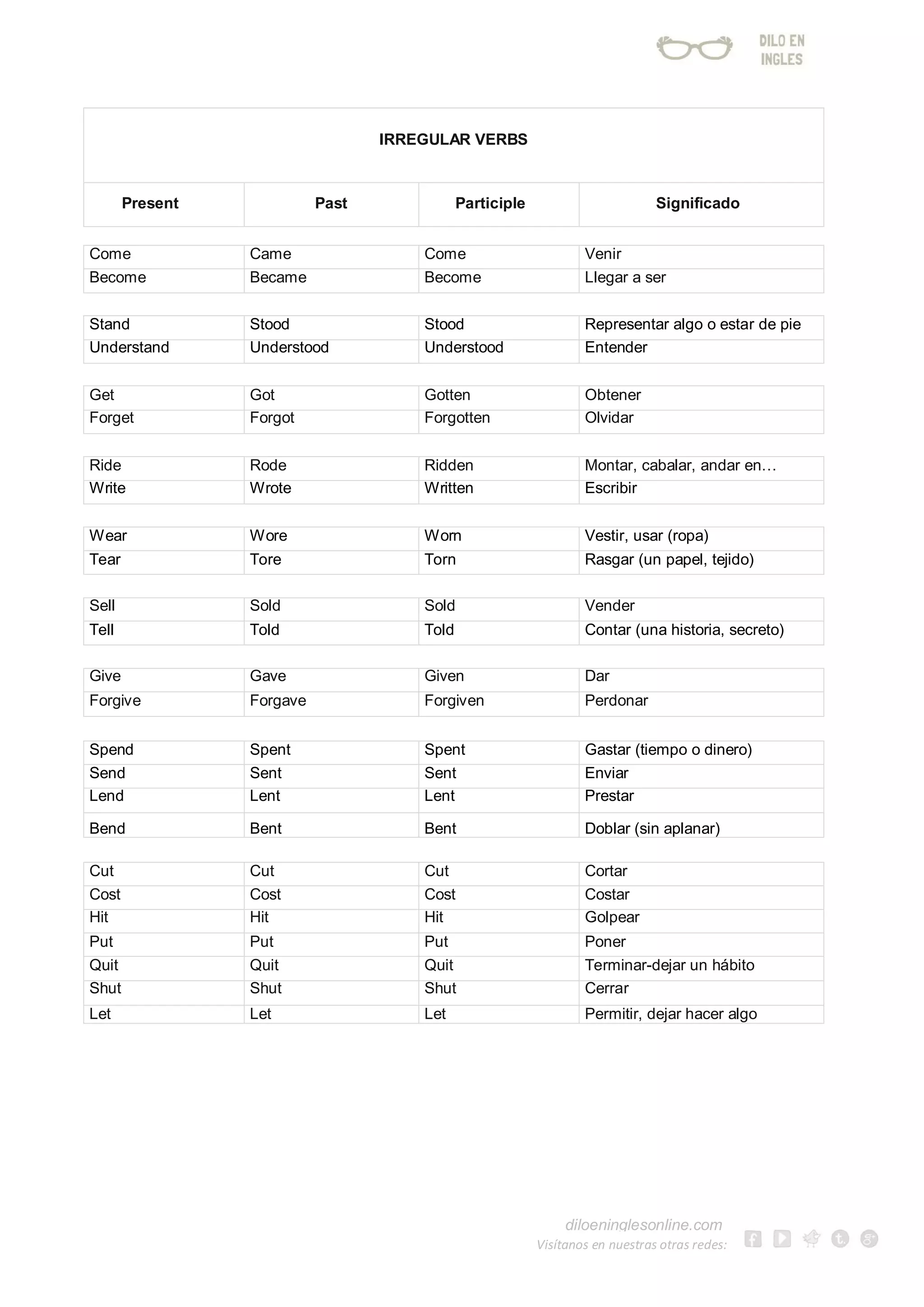 This document contains a list of common irregular English verbs along with their present, past, and past participle forms and Spanish translations. It includes over 80 irregular verbs such as "come/came/come", "become/became/become", "stand/stood/stood", "understand/understood/understood", and "get/got/gotten". The list provides the full conjugation of each irregular verb as well as the meaning in Spanish.