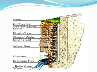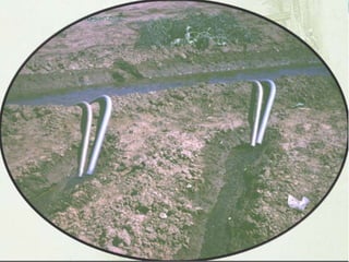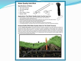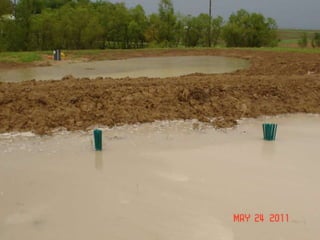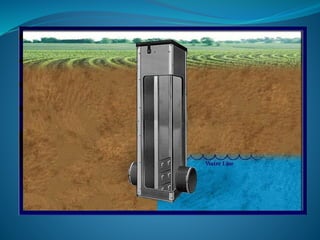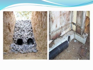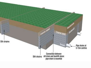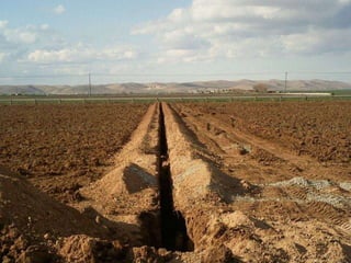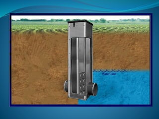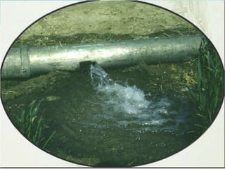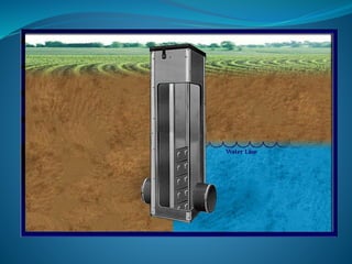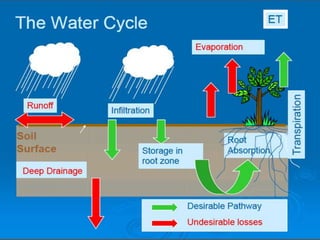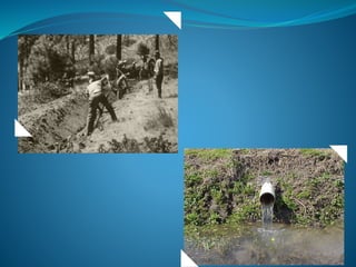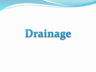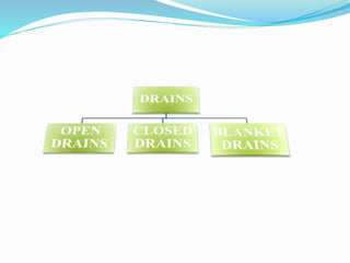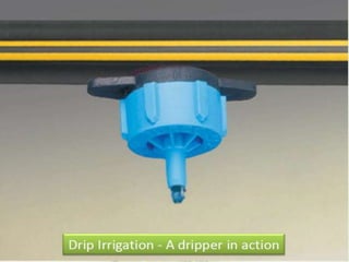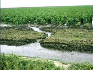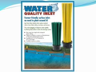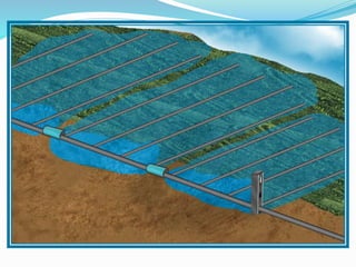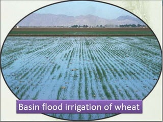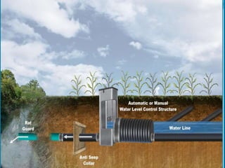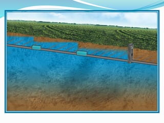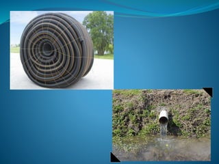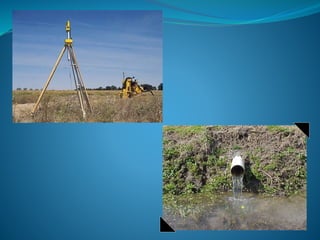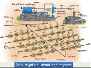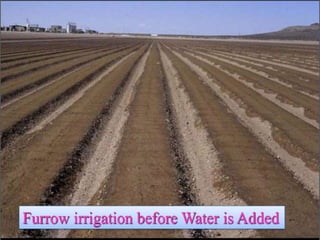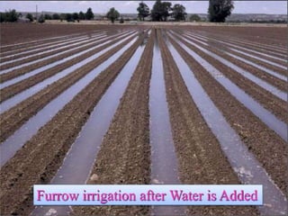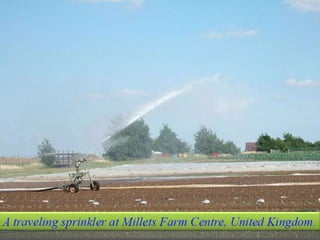 This document provides information about irrigation, including its definition, purposes, history, types, and components. It defines irrigation as the artificial application of water to soil, usually used to assist growing crops in dry areas or during low rainfall. Ancient Mesopotamian engineers built elaborate dam and canal systems to distribute water for agricultural and domestic needs. Modern irrigation systems include surface, center pivot, lateral move, and localized drip/sprinkler methods. Proper drainage of excess water is also important for soil health and equipment access. The document discusses drainage system design considerations based on soil, water table, and crop factors.