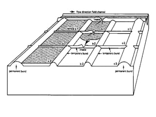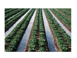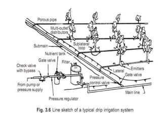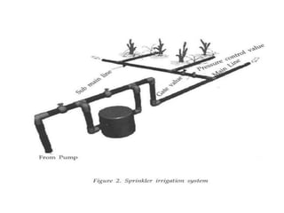 The document discusses irrigation, its necessity, benefits, ill effects, and various methods including surface, subsurface, sprinkler, and trickle (drip) irrigation. It highlights the advantages and disadvantages of each method, such as water loss efficiency and cost considerations, while also emphasizing the importance of the quality of irrigation water. Additionally, it outlines the potential issues caused by impurities in irrigation water and how they can impact agricultural practices.