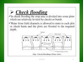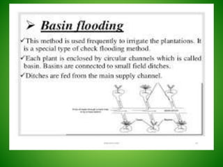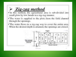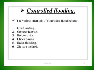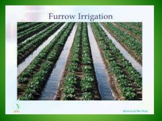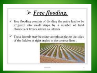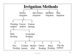This document discusses irrigation engineering and different irrigation methods. It defines irrigation engineering as the process of supplying water to crops artificially. The main methods discussed are surface irrigation, sprinkler irrigation, drip irrigation, and subsurface irrigation. Surface irrigation is the most common worldwide and includes flooding, furrow, and contour farming methods. Flooding involves allowing water to flow freely, furrow uses trenches between rows, and contour farming grows crops across slopes.