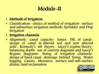 This document discusses various methods of irrigation, including surface irrigation methods like furrow irrigation, contour farming, and flooding methods. It also discusses subsurface irrigation methods like sprinkler irrigation and drip/trickle irrigation. For each method, it describes the basic components and process, as well as advantages and disadvantages. Surface irrigation methods are best suited for row crops, while sprinkler and drip irrigation methods reduce evaporation and allow more precise water and fertilizer application. Drip irrigation in particular minimizes water usage and loss. The document emphasizes matching the appropriate irrigation method to field and crop conditions.