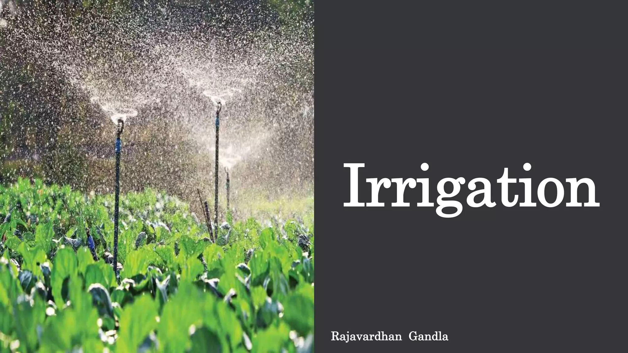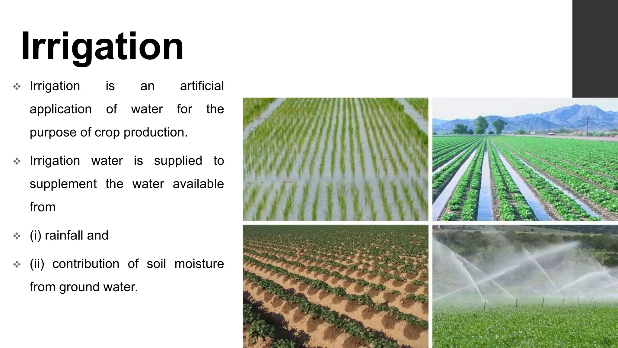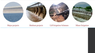 Irrigation is the artificial application of water to supplement rainfall and soil moisture for crop production. It is essential in many areas where the amount and timing of rainfall is inadequate for crop needs. Water is a limited resource that must meet the requirements of crop production as well as industry, consumption, power generation and navigation. Irrigation projects are classified based on irrigated area and cost into major, medium and minor projects. Major sources of irrigation water include rivers, surface reservoirs from dams, and underground reservoirs from wells.