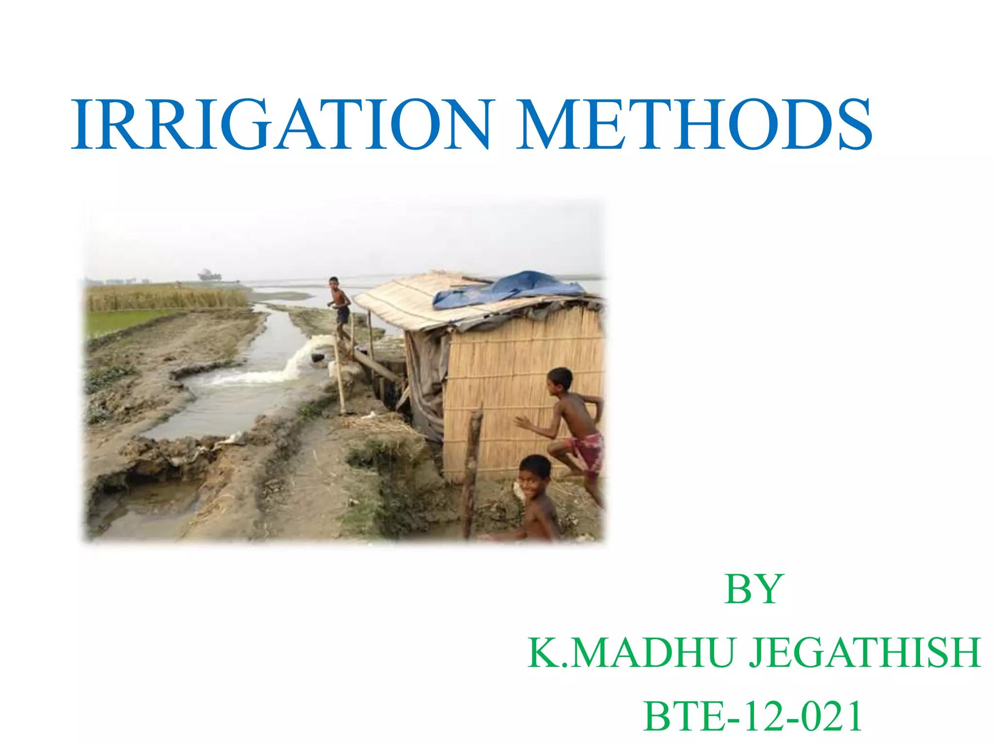 This document discusses various irrigation methods, including uncontrolled surface flooding, controlled flooding using check basins or ring basins, border strip method, deep furrow method, traditional methods like levees and canals, drip irrigation, subsurface drip irrigation, sprinkler irrigation using micro sprays or micro jets, and rain guns. It compares the advantages and disadvantages of different methods and discusses their suitability based on factors like crop type, soil type, water availability, and farming practices.