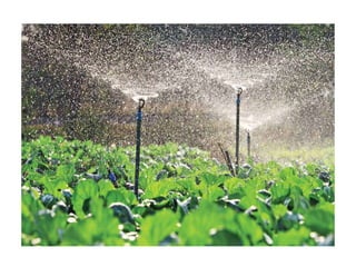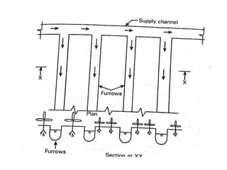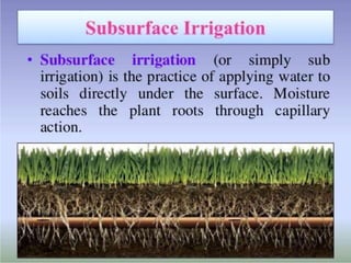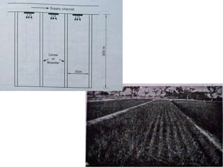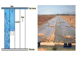 Irrigation methods can be categorized as gravity or flow irrigation and lift irrigation. Gravity irrigation uses water from a higher elevation conveyed via gravity through canals. It can be further divided into perennial and inundation irrigation. Common surface irrigation methods include furrow, border strip, basin, flooding, and wild flooding. Choosing a method depends on factors like soil type, slope, and crop. Surface methods are generally less efficient than pressurized systems but have lower infrastructure costs.