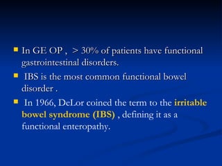 Irritable bowel syndrome (IBS) is a common functional gastrointestinal disorder defined by abdominal pain associated with changes in bowel habits. IBS prevalence ranges from 3-20% worldwide and is more common in younger individuals and women. IBS has subtypes including constipation-predominant, diarrhea-predominant, and mixed-type based on stool consistency. The pathophysiology of IBS involves abnormal gut motility, visceral hypersensitivity, brain-gut axis dysregulation, and abnormal chemical signaling. Treatment focuses on diet, medication to relieve symptoms, and psychological therapies depending on the individual's dominant symptoms and severity.