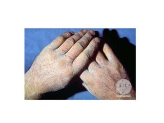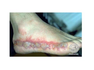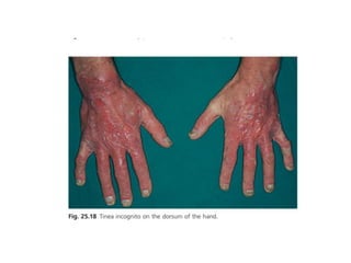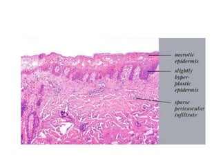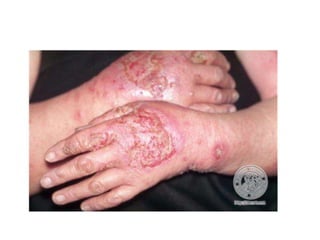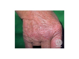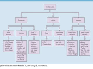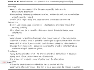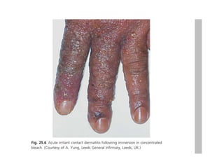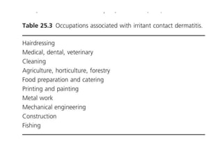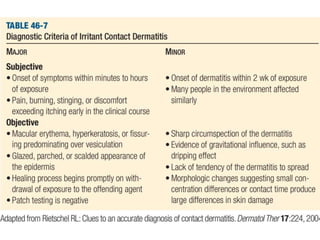 Irritant contact dermatitis (ICD) is caused by direct cytotoxic effects of physical or chemical irritants on the skin. Acute ICD presents with erythema, edema, vesiculation and erosion while chronic ICD shows lichenification, hyperkeratosis and fissures. ICD is commonly caused by occupational exposure to chemicals like acids, alkalis, metals, solvents, detergents and cleansers. Clinical features depend on properties of the irritant, host factors, and environment. Management involves avoiding irritants, using protective measures, and restoring the skin barrier with emollients and moisturizers.