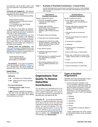 Publication 526 provides guidelines on how to claim deductions for charitable contributions, including which organizations qualify and the types of contributions that are deductible. It outlines rules for contributions of property, limits on deductions, and necessary records to keep, as well as specific examples to clarify the rules. The document highlights that contributions made to benefit individuals are generally not deductible, while those to recognized charitable organizations are eligible for deductions.