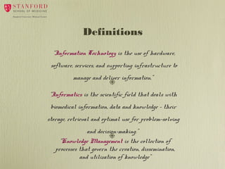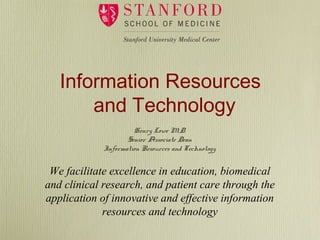 The document discusses the goals and strategic plan of the Information Resources and Technology department at a medical school. It aims to [1] facilitate excellence in education, research, and patient care through innovative IT; [2] integrate IT, informatics, and knowledge management to support the biomedical mission; and [3] have IRT driven by a strategic plan and support the various missions. Some key initiatives include implementing a wireless network, establishing an information privacy director, developing the library as a knowledge center, and creating a clinical informatics center to foster applied informatics.