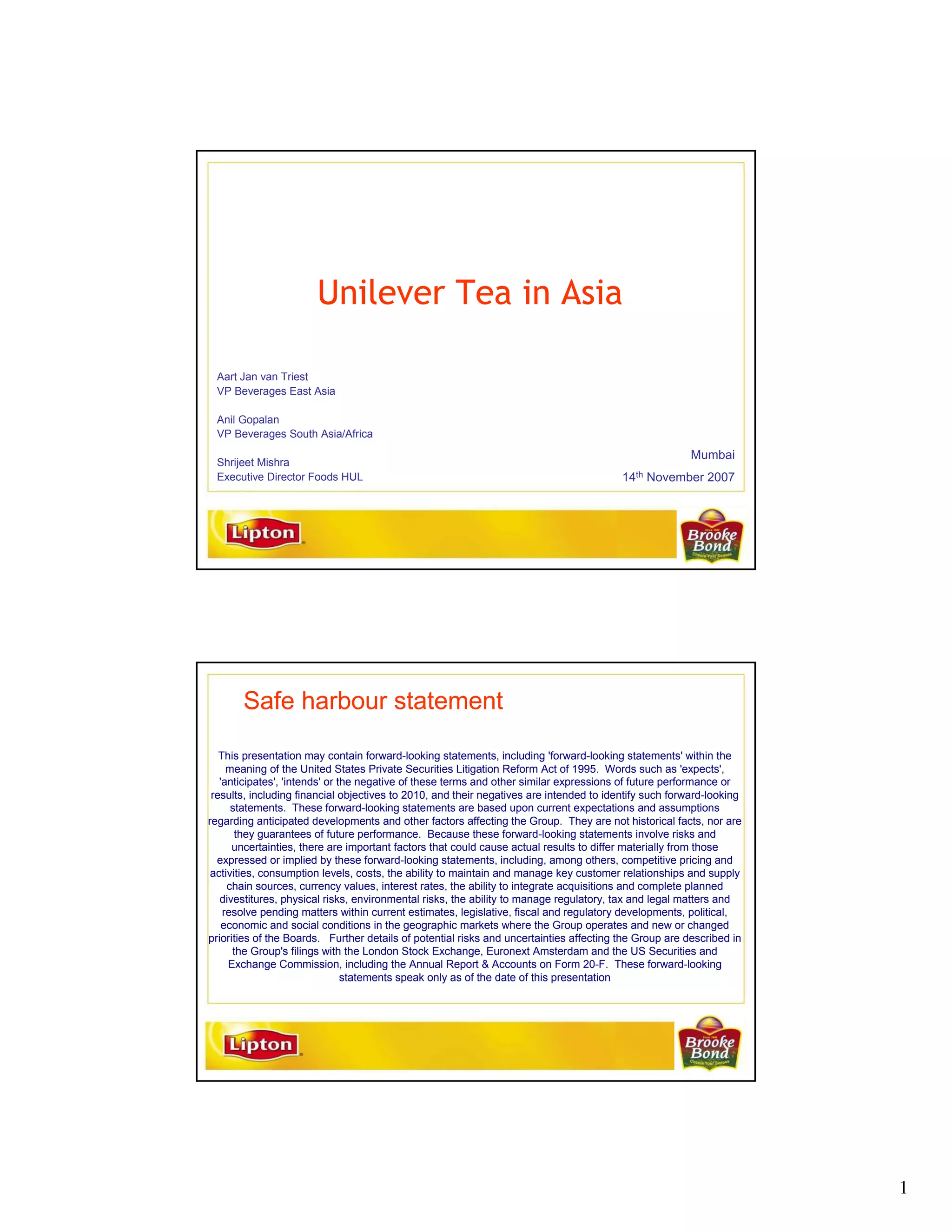Unilever has strong tea brand positions in Asia, with Lipton and Brooke Bond being their #1 or #2 brands in many markets. Since 2005, Unilever's tea sales in Asia have grown steadily due to capturing the opportunity of providing "vitality-thirsty consumers" with healthy tea products. Both Lipton and Brooke Bond are pursuing growth strategies focused on portfolio expansion, upgrading consumers, increasing usage occasions, and rethinking tea drinks. The strategies involve innovations, engagement initiatives, and partnerships to drive the tea business forward in Asia.