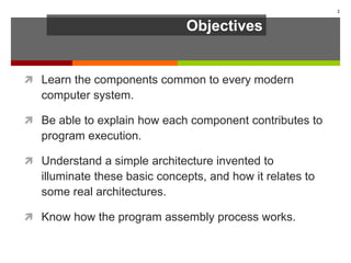 The document provides an overview of the components and architecture of the MARIE computer system, which was designed to illustrate basic computer concepts. It describes the CPU, registers, memory, bus, instruction set, and fetch-decode-execute cycle. The MARIE CPU has 7 registers, including the accumulator, program counter, and instruction register. It uses a 16-bit instruction format. Example load and add instructions are shown in register transfer language to demonstrate how instructions are executed as a series of microoperations. Interrupts can alter the execution cycle by adding an additional "process interrupt" step.