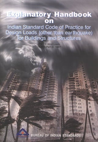 This document provides an introduction to the Indian Standard Code of Practice for Design Loads (Other than Earthquake) for Buildings and Structures Part 3 Wind Loads [IS 875 (Part 3): 1987]. It discusses the background and shortfalls of the previous 1964 code. The nature of wind is described, distinguishing between rotating winds like cyclones and tornadoes, and non-rotating pressure system winds. The new 1987 code aims to provide more rational wind loading guidelines based on recent advances in understanding wind effects on structures.