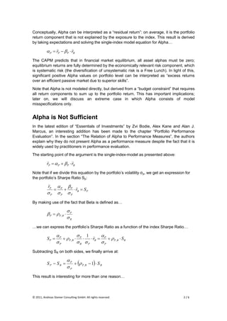 The document discusses whether the concept of "Alpha" is a useful performance metric for investors. It makes two main arguments: