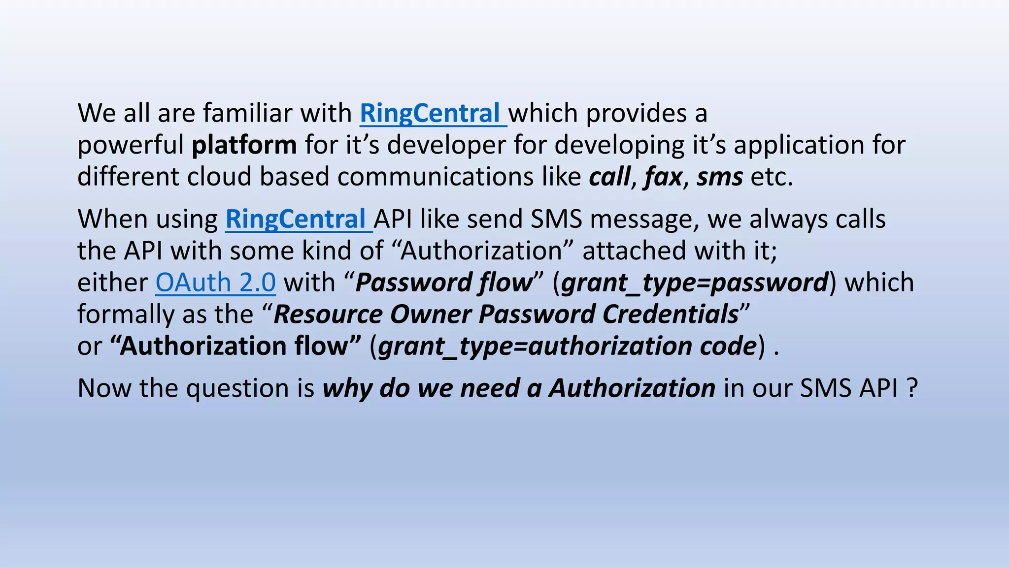 - Authorization is always required when using RingCentral APIs like sending SMS messages to prevent abuse and misuse of the API. This acts as a protection for APIs that deal with real phone numbers.