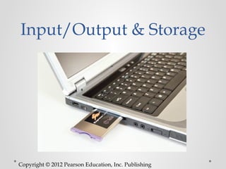 The document discusses input, output, and storage devices used in computers. It describes various keyboards, pointing devices, monitors, and printers as common input and output components. It also explains the differences between memory and storage, how data is stored on hard drives using tracks and sectors, and various storage media like hard disks, flash drives, and optical discs. Performance factors for hard disks are outlined as well as new storage technologies.