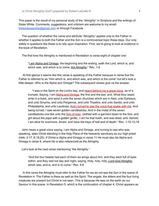 This document discusses whether Christ is referred to as the Almighty God in scripture. It examines several passages in Revelation where the Almighty is mentioned and analyzes the context to determine if it is referring to God the Father or to Christ. It also looks at statements from Ellen White where she refers to Christ as the Alpha and Omega and Almighty God. The document concludes that both the Father and the Son are referred to as the Almighty in scripture and that Christ appears as the Almighty God several times in the Old Testament record, such as when speaking to Abraham.