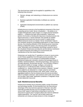 The document discusses cloud computing and infrastructure as a service (IaaS) models. It defines cloud computing as the real-time delivery and consumption of IT infrastructure, networking, and application services over the internet or private networks. IaaS leverages virtualization and automation to create scalable pools of hardware, software, and network resources that can be dynamically provisioned on demand. The document examines how enterprises can use IaaS to access a fully managed IT infrastructure from third-party providers in a flexible and cost-effective manner without large upfront capital expenditures.