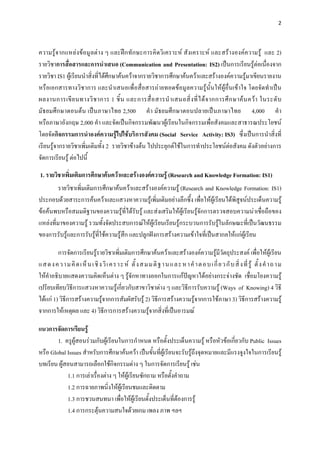 ระดับคุณภาพ ประเด็นการประเมิน ดีเยี่ยม (4) ดี (3) พอใช (2) ปรับปรุง (1) 4.นําองค ความรูที่ไ ดไปเสนอ 4.นําองค ความรู ที่ไ ดไปเสนอ 4.นํ า องค ค วามรู ที่ ไ ด ไ ปเสนอ 4.ไมมีการนําองคความรูไปเสนอ แนวคิด วิธีการแกปญหาอยาง แนวคิด วิธีการแกปญหาไดแต วิธีการแกปญหาไดแตยังไมเปน แนวคิด วิธีการแกปญหา เปนระบบ ยังไมเปนระบบ ระบบ 4.การสื่อสารและการนําเสนอ 1. เ รี ยบเรี ย ง แ ล ะ ถ า ย ท อ ด 1. เ รี ยบเรี ย ง แ ล ะ ถ า ย ท อ ด 1 . เ รี ย บ เ รี ย ง แ ล ะ ถ า ย ท อ ด 1.เรียบเรียงและถายทอดความคิด ความคิดจากการศึกษาคนควา ความคิดจากการศึกษาคนควา ความคิดจากการศึกษาคนควาได จากการศึกษาคนควาได ได อ ย า งสร า งสรรค แ ละเป น ได อ ย า งสร า งสรรค แ ละเป น อยางชัดเจน ระบบ ระบบ 2.เขียนรายงานการศึกษาคนควาได 2.เขี ย นรายงานการศึ ก ษา 2.เขี ย นรายงานการศึ ก ษา 2.เขียนรายงานการศึกษาคนควา โดยอางอิงแหลงความรูในประเทศ ค น ค ว า เ ชิ ง วิ ช า ก า ร เ ป น ค น ค ว า เ ชิ ง วิ ช า ก า ร เ ป น เชิงวิชาการเปนภาษาไทยความ ภาษาไทยความยาว 4,000 คํ า ภาษาไทยความยาว 4,000 คํ า ยาว 4,000 คํา โดยอางอิงแหลง และภาษาอั ง กฤษความยาว หรื อ ภาษาอั ง กฤษความยาว ความรูที่เชื่อถือไดในประเทศ 2,500 คํ า โดยอ า งอิ ง แหล ง 2,500 คํ า โดยอ า งอิ ง แหล ง ความรู ที่ เ ชื่ อ ถื อ ได ทั้ ง ในและ ความรู ที่ เ ชื่ อ ถื อ ได ทั้ ง ในและ ตางประเทศ ตางประเทศ