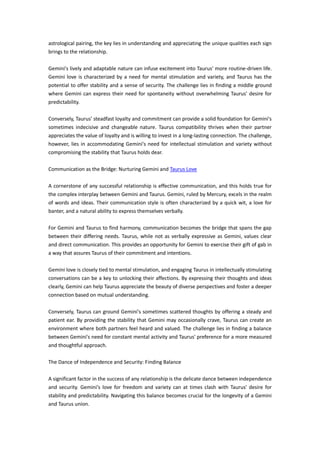 This document explores the compatibility between Gemini and Taurus, highlighting their contrasting elemental natures and the challenges they may face in relationships. Gemini's need for intellectual stimulation and freedom can clash with Taurus' desire for stability and routine; however, effective communication and mutual understanding can help bridge these differences. By embracing their unique qualities and finding common ground, Gemini and Taurus can cultivate a fulfilling and harmonious relationship.