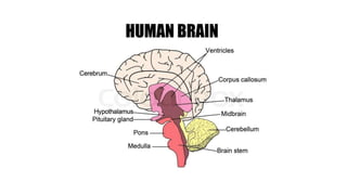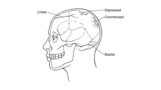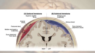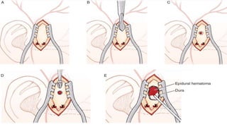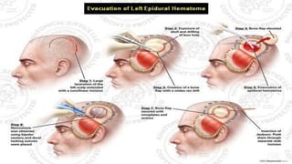 The document discusses the anatomy of the brain, cranial meninges, types of head injuries including epidural hematoma. It describes the signs and symptoms of epidural hematoma, methods of diagnosis including CT scan, and treatment involving craniotomy or burr hole evacuation surgery.