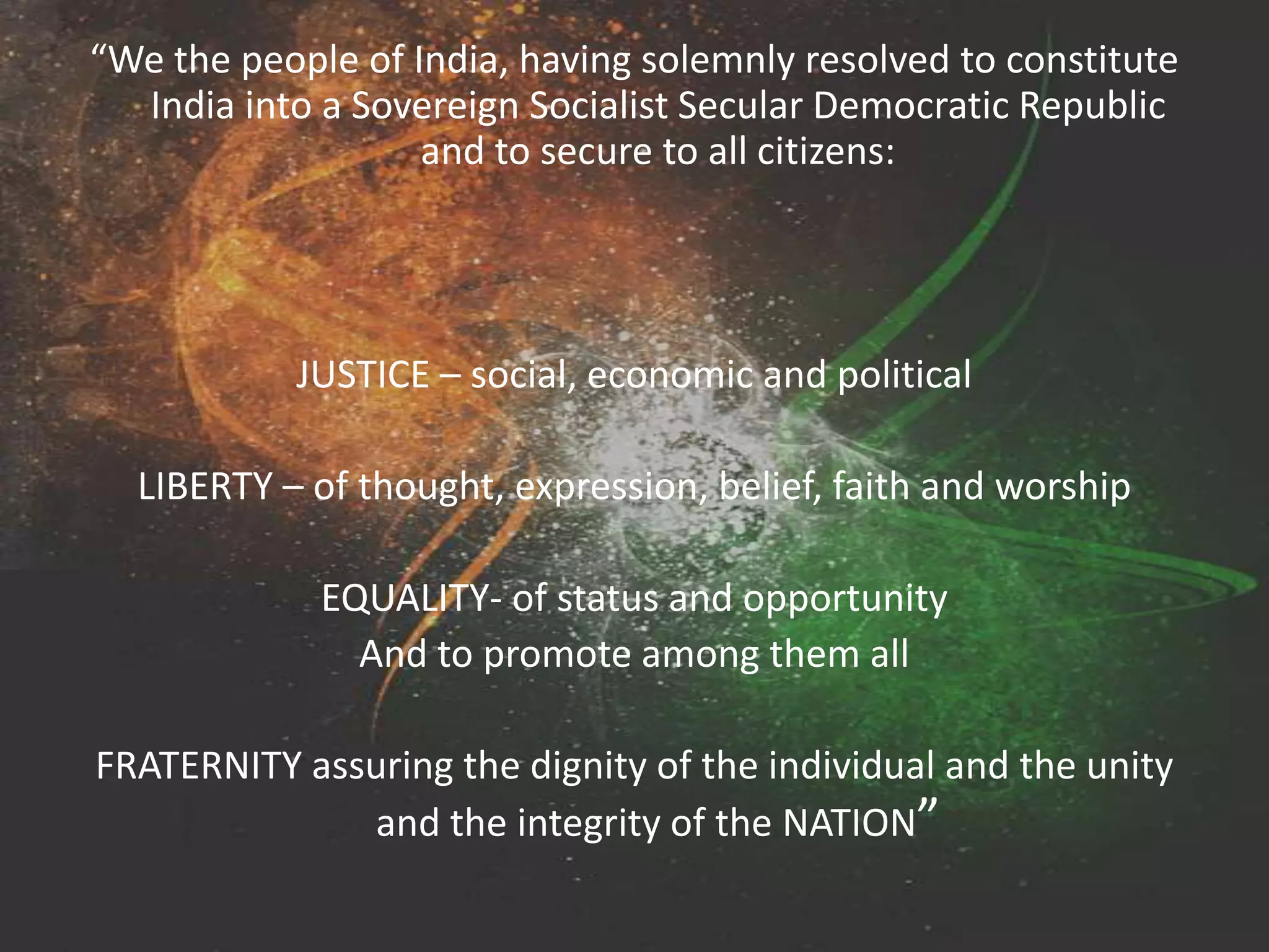 The document discusses the Indian Constitution's commitment to establishing a sovereign, socialist, secular, and democratic republic that assures justice, liberty, equality, and fraternity. It critiques the current effectiveness of the judicial system, highlighting issues such as pending cases and calls for various fundamental rights and duties to be revised or added. The author recommends reforms for faster justice delivery and accountability for politicians, suggesting specific changes to improve the justice system and citizen rights.
