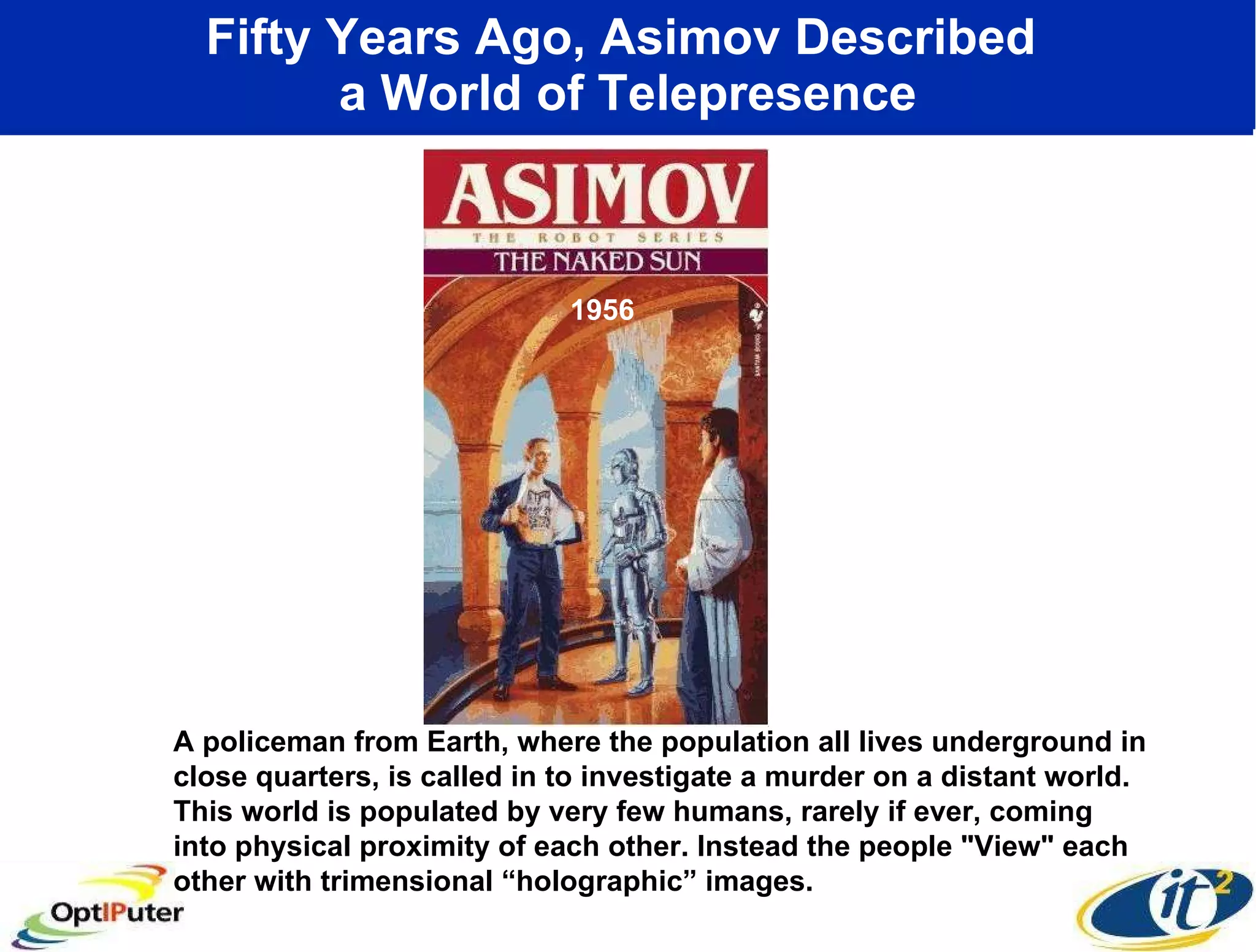 The keynote talk by Dr. Larry Smarr discusses the evolution and future of telepresence technologies, emphasizing the potential for eliminating distance in communication through advanced optical networks and high-bandwidth applications. It highlights innovations in telepresence, from early experiments to modern applications in collaborative research and virtual reality. The document also reflects on the growing capabilities of global collaboration in science and technology, paving the way for a more interconnected future.