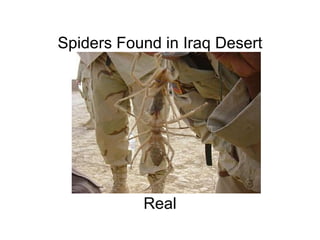 The document appears to be a list of various images or news stories with descriptions, and whether they are labeled as real or fake. Some of the items listed as real include spiders found in the Iraqi desert, the world's highest bridge, black and white twin deer, an albino fawn, human remains found inside a crocodile, a dog that met a porcupine, a giant grizzly bear, and a forest fire in Montana. Some items labeled as fake include a dead wife inside a coffee table, a satellite photo of a space shuttle tragedy, and claims of an animal-human hybrid. The list seems to cover a wide range of unusual or intriguing subject matter and provides judgments on their factual authenticity.