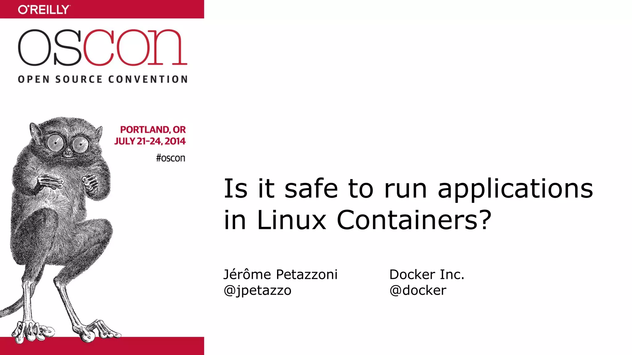 The document discusses the security of running applications in Linux containers. It begins by acknowledging that containers were not originally designed with security in mind. However, it then outlines several techniques that can be used to improve security, such as running containers without root privileges, dropping capabilities, enabling security modules like SELinux, and limiting access to devices and system calls. For the most security-sensitive tasks, it recommends running containers inside virtual machines to isolate them further. In the end, it argues that with the right precautions, containers can be used securely for many applications.