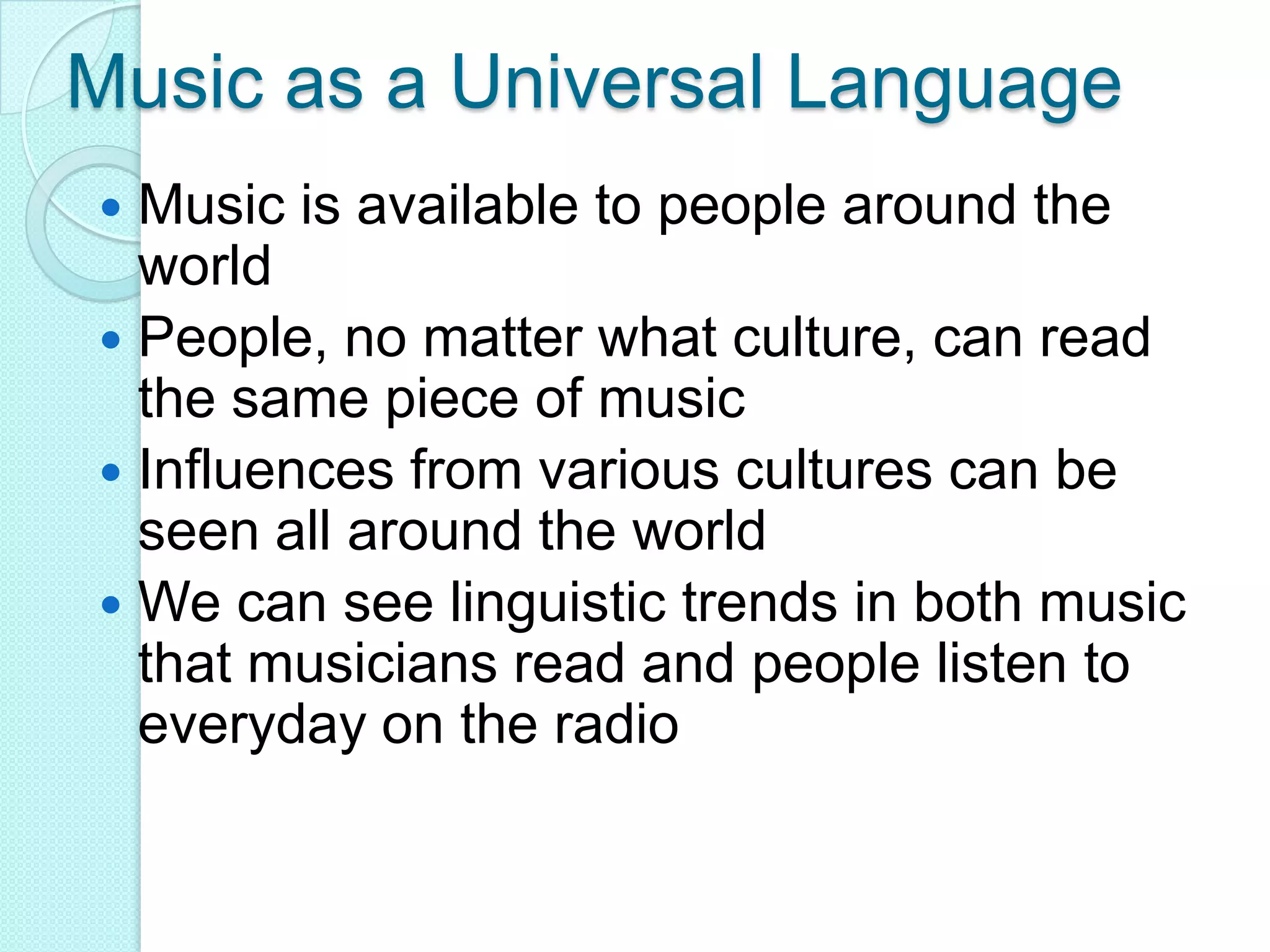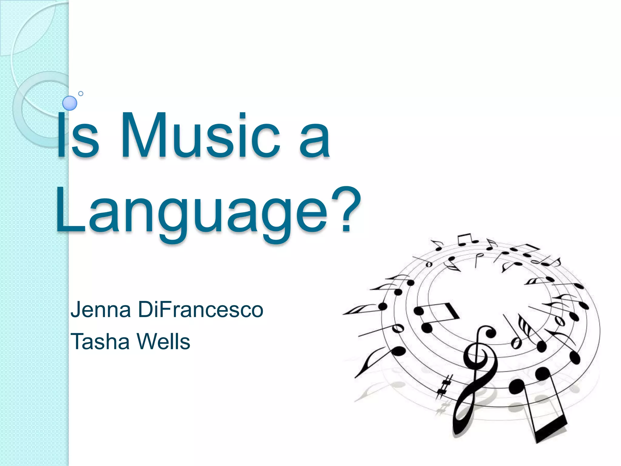 This document discusses whether music can be considered a language. It provides evidence that music exhibits the nine main characteristics of language, including having a mode of communication through musical notes, semantics through conveying meaning, and cultural transmission through different styles across countries. The document also analyzes how musical notation shares similarities with linguistic structure and categories. Overall, it argues that music qualifies as a language, especially when considering its written form and ability to communicate and share information between musicians globally.