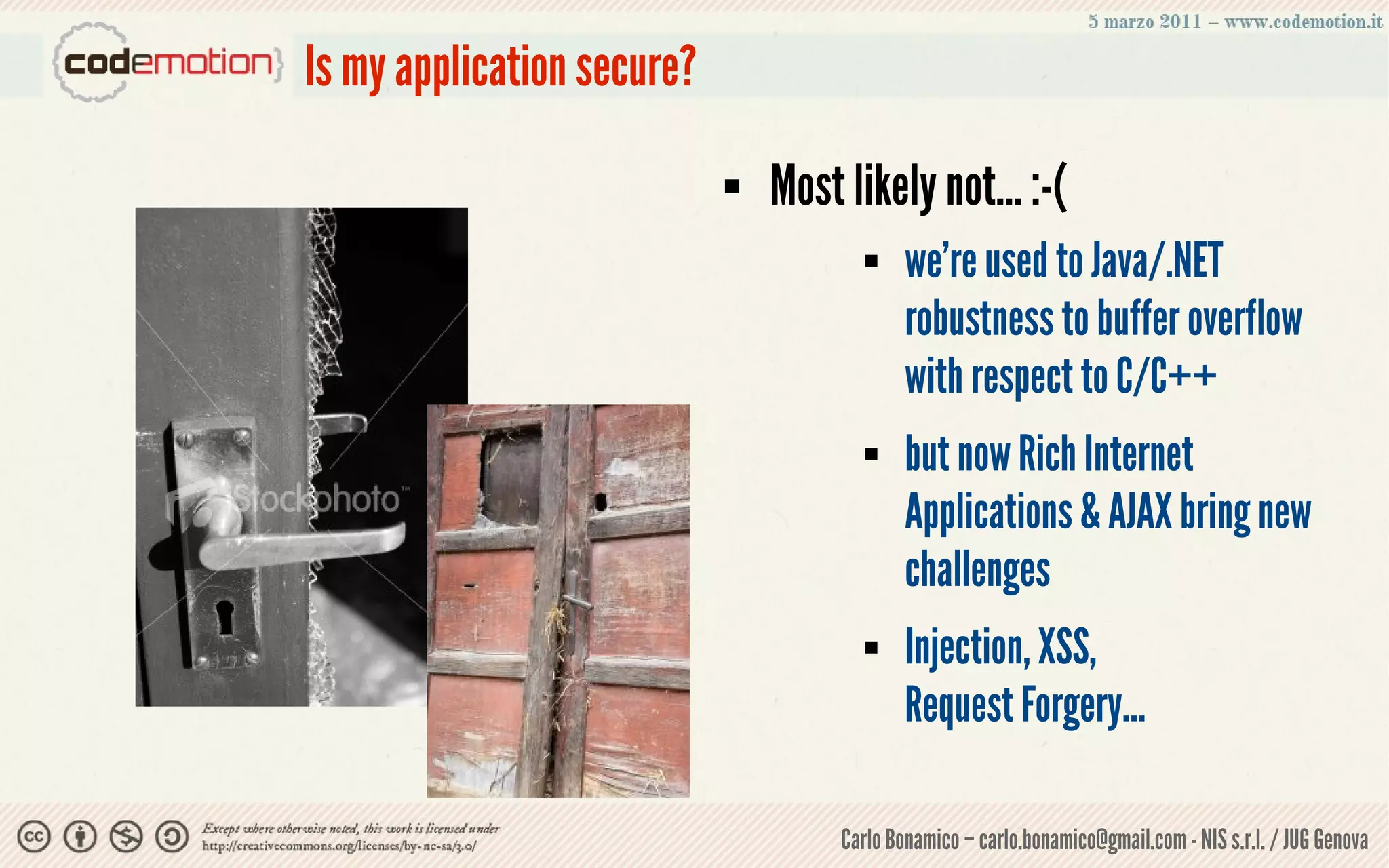 This document summarizes a presentation on web application security risks. It discusses how most web applications are not securely developed by default and are vulnerable to attacks like injection and cross-site scripting. It introduces the OWASP Top 10 project, which identifies the top 10 security risks faced by web applications. The presentation focuses on the risks of injection and cross-site scripting attacks, and approaches for mitigating these risks, including using frameworks like Spring Security and the OWASP Enterprise Security API.
