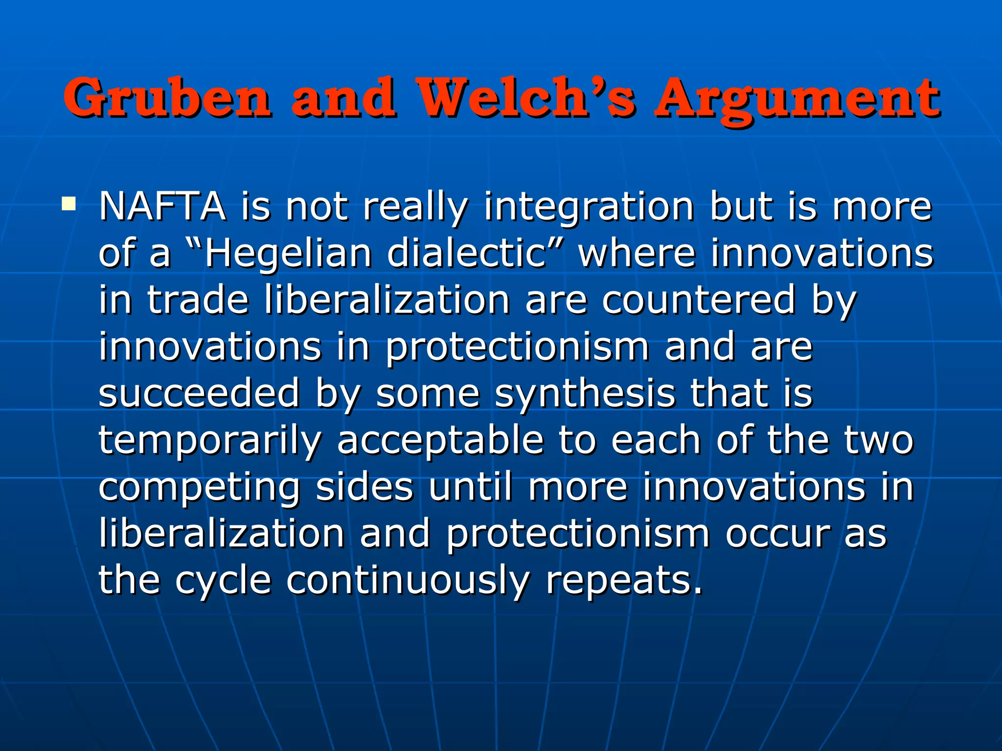 The document discusses Gruben and Welch's argument that NAFTA is better described as a "Hegelian dialectic" of liberalization and protectionism rather than true economic integration. The authors claim NAFTA liberalizes trade to some extent but also includes protections for sensitive industries. Critics argue the examples of protectionism are weak and NAFTA has led to more integration and liberalization in North America, weakening the Hegelian dialectic view.