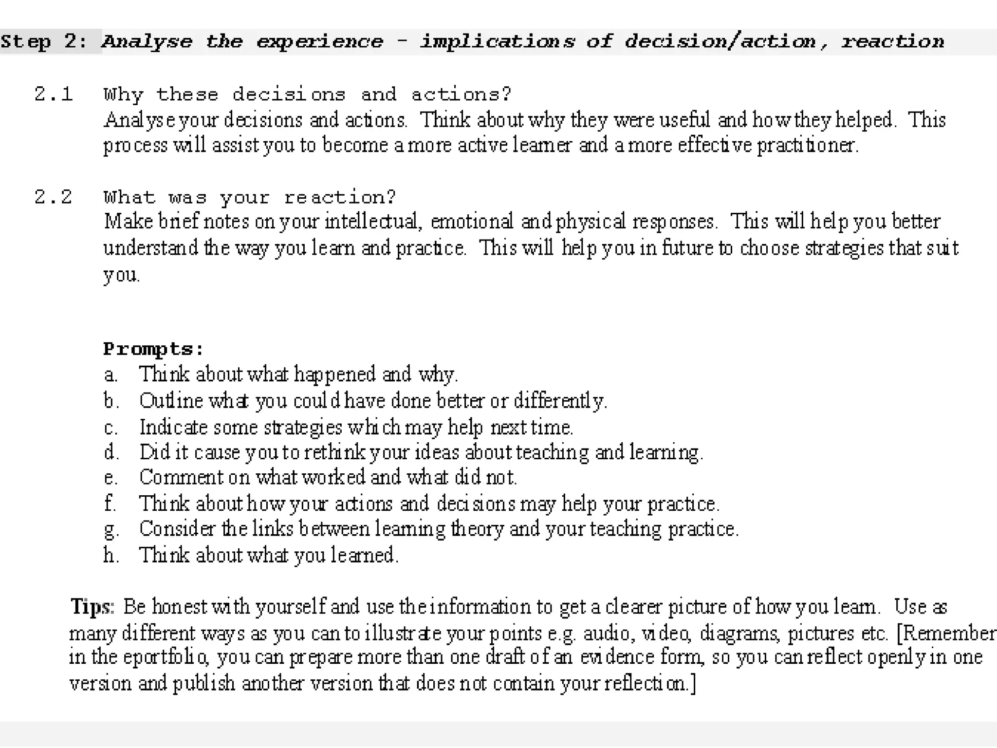 The document discusses whether preparing an electronic portfolio can help develop skills for reflective practice. It presents research on a three-step reflective framework used to scaffold reflective writing when students wrote for their e-portfolios. The results showed that the framework helped students write at descriptive, explanatory, and supported levels of reflection. It demonstrated that reflecting on experiences, feelings, thoughts and applying knowledge to practice can engage learners reflectively with their work.
